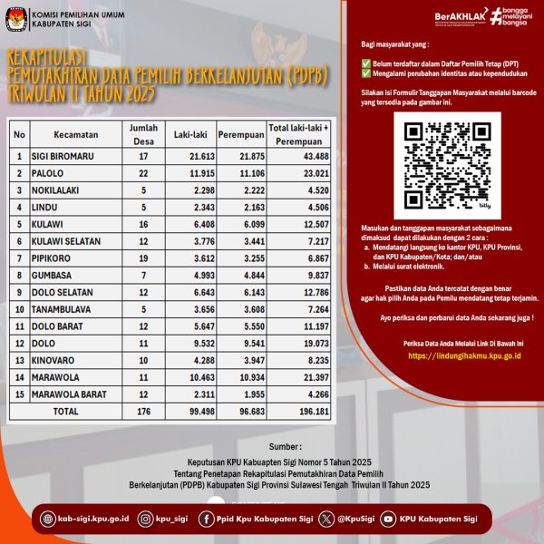 Sigi, 2 Oktober 2025 – Komisi Pemilihan Umum (KPU) Kabupaten Sigi melaksanakan Rapat Pleno Rekapitulasi Pemutakhiran Data Pemilih Berkelanjutan (PDPB) Periode Triwulan III Tahun 2025, yang bertempat di Aula Kantor KPU Kabupaten Sigi. Kegiatan ini dihadiri oleh Ketua dan Anggota KPU Kabupaten Sigi bersama jajaran sekretariat, serta turut mengundang perwakilan Forkopimda dan sejumlah instansi/lembaga terkait di Kabupaten Sigi, antara lain Bupati Sigi, Ketua DPRD Kabupaten Sigi, Ketua Bawaslu Kabupaten Sigi, Kepala Dinas Dukcapil Kabupaten Sigi, Kepala Dinas PMD Kabupaten Sigi, Kepala Badan Kesbangpol Kabupaten Sigi, Kapolres Sigi, Dandim 1306 Palu, Kepala Kantor bada Pusat Statistik Kabupaten Sigi, serta Kepala Lapas Perempuan Kelas III Palu. Berdasarkan hasil rekapitulasi yang dituangkan dalam Berita Acara Nomor: 31/PP.07-BA/7210/2025, jumlah pemilih berkelanjutan Kabupaten Sigi pada Triwulan III Tahun 2025 tercatat sebanyak 201.915 pemilih, dengan rincian : Laki-laki: 102.568 pemilih Perempuan: 99.347 pemilih Total: 201.915 pemilih Sebaran: 15 kecamatan, 176 desa/kelurahan Data tersebut merupakan hasil dari proses pemutakhiran yang mencakup penambahan pemilih baru, penghapusan pemilih tidak memenuhi syarat (TMS), serta perbaikan elemen data pemilih. Dalam kesempatan tersebut, Anggota KPU Kabupaten Sigi Rosnawati menegaskan bahwa pemutakhiran data pemilih berkelanjutan merupakan langkah penting untuk menjaga kualitas daftar pemilih. “Kami berkomitmen untuk terus menjaga kualitas data pemilih sebagai fondasi utama penyelenggaraan pemilu dan pemilihan yang demokratis. Keterlibatan masyarakat juga sangat penting, oleh karena itu kami membuka ruang bagi publik untuk memberikan masukan apabila terdapat data pemilih yang masih perlu diperbaiki,” ujarnya. Melalui pemutakhiran ini, KPU Kabupaten Sigi berharap daftar pemilih yang akan digunakan pada pemilu maupun pemilihan serentak mendatang dapat lebih valid, mutakhir, akurat, serta dapat dipertanggungjawabkan, Serta Menghimbau Mayarakat Kabupaten sigi Untuk melakukan Pengecekan data pemili melalui aplikasi DPT Online atau Website cekdptonline.kpu.go.id atau mendatangi kantor KPU setiaphari kerja. ....