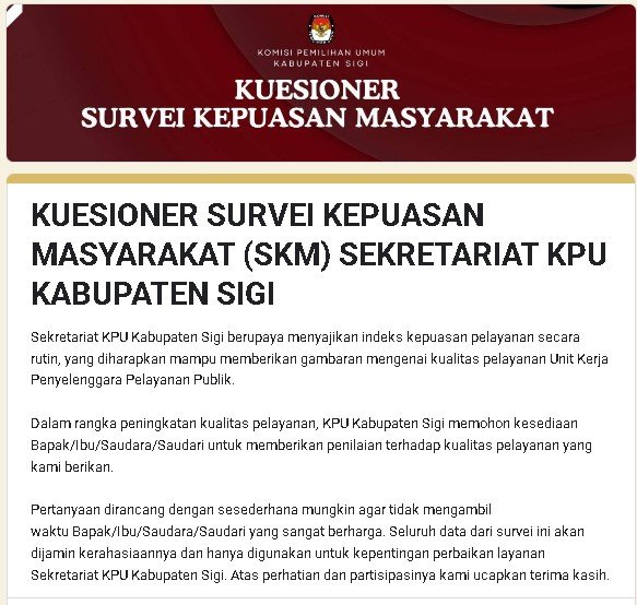 Sekretariat KPU Kabupaten Sigi berupaya menyajikan indeks kepuasan pelayanan secara rutin, yang diharapkan mampu memberikan gambaran mengenai kualitas pelayanan Unit Kerja Penyelenggara Pelayanan Publik. Dalam rangka peningkatan kualitas pelayanan, KPU Kabupaten Sigi memohon kesediaan Bapak/Ibu/Saudara/Saudari untuk memberikan penilaian terhadap kualitas pelayanan yang kami berikan. Pertanyaan dirancang dengan sesederhana mungkin agar tidak mengambil waktu Bapak/Ibu/Saudara/Saudari yang sangat berharga. Seluruh data dari survei ini akan dijamin kerahasiaannya dan hanya digunakan untuk kepentingan perbaikan layanan Sekretariat KPU Kabupaten Sigi. Atas perhatian dan partisipasinya kami ucapkan terima kasih. Silahkan Isi Quisioner Pada Link Ini : KUESIONER SURVEI KEPUASAN MASYARAKAT