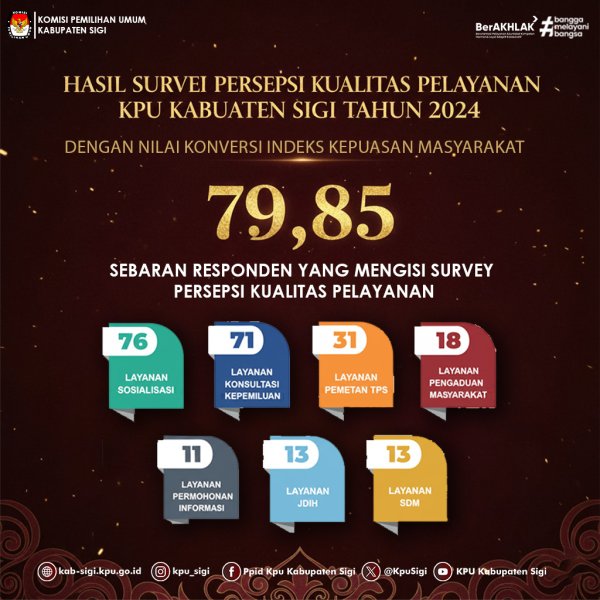 Sigi – Komisi Pemilihan Umum (KPU) Kabupaten Sigi melaksanakan Survei Persepsi Kualitas Pelayanan sepanjang tahun 2024 sebagai bentuk evaluasi terhadap layanan publik yang diberikan. Dari hasil survei tersebut, KPU Kabupaten Sigi memperoleh nilai konversi Indeks Kepuasan Masyarakat (IKM) sebesar 79,85. Capaian ini menjadi gambaran bahwa secara umum pelayanan yang diberikan KPU Kabupaten Sigi mendapat apresiasi positif dari masyarakat, sekaligus menjadi dorongan untuk terus meningkatkan mutu pelayanan di tahun-tahun berikutnya. Adapun responden yang berpartisipasi dalam survei ini tersebar pada berbagai jenis layanan, di antaranya: 76 responden pada layanan sosialisasi, 71 responden pada layanan konsultasi kepemiluan, 31 responden pada layanan pemetaan TPS, 18 responden pada layanan pengaduan masyarakat, 13 responden pada layanan JDIH, 13 responden pada layanan SDM, 11 responden pada layanan permohonan informasi. Ketua KPU Kabupaten Sigi menyampaikan apresiasi dan terima kasih kepada masyarakat yang telah turut serta mengisi survei ini. “Masukan dari masyarakat sangat berarti bagi kami. Hasil survei ini akan menjadi bahan evaluasi untuk perbaikan dan peningkatan kualitas layanan di masa mendatang,” ujarnya. KPU Kabupaten Sigi menegaskan komitmennya untuk terus menghadirkan pelayanan yang transparan, cepat, dan responsif, sejalan dengan semangat BerAKHLAK serta visi menjadi lembaga penyelenggara pemilu yang profesional dan berintegritas. ....
