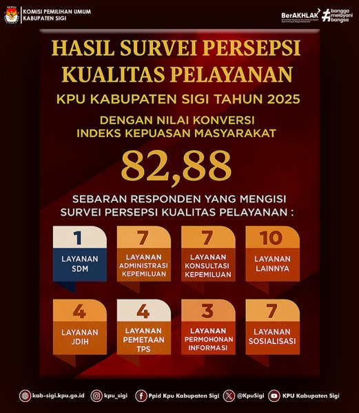 Sigi – Komisi Pemilihan Umum (KPU) Kabupaten Sigi kembali melaksanakan Survei Persepsi Kualitas Pelayanan pada tahun 2025 sebagai bentuk komitmen meningkatkan mutu pelayanan kepada masyarakat. Berdasarkan hasil survei, KPU Kabupaten Sigi memperoleh nilai konversi Indeks Kepuasan Masyarakat sebesar 82,88. Nilai tersebut menunjukkan bahwa layanan KPU Kabupaten Sigi dinilai baik dan memuaskan oleh responden. Survei ini melibatkan berbagai responden yang pernah mengakses layanan KPU, dengan sebaran sebagai berikut: 1 responden untuk layanan SDM, 7 responden untuk layanan administrasi kepemiluan, 7 responden untuk layanan konsultasi kepemiluan, 10 responden untuk layanan lainnya, 4 responden untuk layanan JDIH, 4 responden untuk layanan pemetaan TPS, 3 responden untuk layanan permohonan informasi, 7 responden untuk layanan sosialisasi. Ketua KPU Kabupaten Sigi menyampaikan apresiasi kepada seluruh masyarakat yang telah berpartisipasi dalam survei ini. “Hasil survei ini menjadi masukan penting bagi kami untuk terus melakukan evaluasi dan perbaikan agar pelayanan KPU semakin baik, transparan, dan responsif terhadap kebutuhan masyarakat,” ujarnya. Dengan hasil survei ini, KPU Kabupaten Sigi berkomitmen untuk terus menjaga kualitas pelayanan publik serta mendukung terwujudnya lembaga penyelenggara pemilu yang profesional, berintegritas, dan melayani. ....