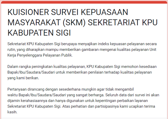 Sekretariat KPU Kabupaten Sigi berupaya menyajikan indeks kepuasan pelayanan secara rutin, yang diharapkan mampu memberikan gambaran mengenai kualitas pelayanan Unit Kerja Penyelenggara Pelayanan Publik. Dalam rangka peningkatan kualitas pelayanan, KPU Kabupaten Sigi memohon kesediaan Bapak/Ibu/Saudara/Saudari untuk memberikan penilaian terhadap kualitas pelayanan yang kami berikan. Pertanyaan dirancang dengan sesederhana mungkin agar tidak mengambil waktu Bapak/Ibu/Saudara/Saudari yang sangat berharga. Seluruh data dari survei ini akan dijamin kerahasiaannya dan hanya digunakan untuk kepentingan perbaikan layanan Sekretariat KPU Kabupaten Sigi. Atas perhatian dan partisipasinya kami ucapkan terima kasih. Silahkan Isi Quisioner Pada Link Ini : KUESIONER SURVEI KEPUASAN MASYARAKAT