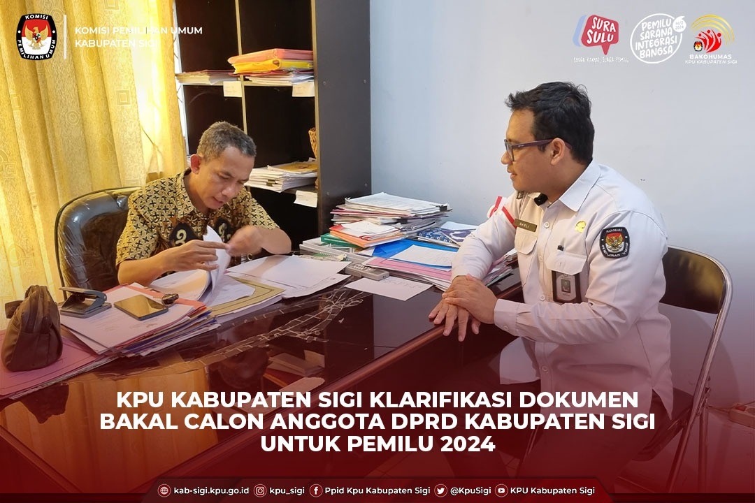 Sigi kab-sigi.kpu.go.id pasca diumumkan DCS Anggota Dewan Perwakilan Rakyat Daerah Kabupaten Sigi untuk Pemilu tahun 2024 sejak 19-23 Agustus 2024, dimana diberi ruang kepada publik untuk memberi masukan dan tanggapan terhadap pengumuman DCS tersebut ,Kamis (31/08/2023) Komisi Pemilihan Umum Kabupaten Sigi setelah merekapitulasi masukan dan tanggapan masyarakat, lanjut melakukan klarifikasi terhadap dokumen bakal calon anggota legislatif, salah satu dinas terkait yakni kantor Badan Pemberdayaan Masyarakat dan Pemerintahan Desa Kabupaten Donggala yang beralamat di kawasan perkantoran jalan Jati No.28 Kelurahan Gunung Bale Kecamatan Banawa. Ditemui diruangannya, Ihlal Kepala Bidang Penyelenggaraan Pemerintahan Desa melakukan pengecekan data-data yang diajukan oleh Sasli selaku Kasubag Teknis Penyelenggaraan Pemilu, Partisipasi dan Hubungan Masyarakat Sekretariat KPU Kabupaten Sigi. Data yang dimaksud adalah BPD (Badan Permusyawaratan Desa) disalah satu desa di wilayah Kabupaten Donggala. Berdasarkan data yang dihimpun, selanjutnya KPU Kabupaten Sigi nantinya akan memberitahukan kepada partai politik untuk ditanggapi dimasa pencermatan DCT. [humas kpu kab sigi dian/fotobagas/editorsasli]