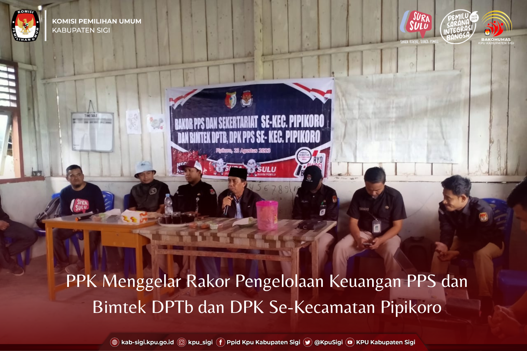 Sigi, kab-sigi.kpu.go.id – Panitia Pemilihan Kecamatan (PPK) menggelar Rakor pengelolaan keuangan PPS dan Bimtek DPTb dan DPK Se Kecamatan Pipikoro yang di hadiri oleh KPU Kabupaten Sigi yang laksanakan di Kecamatan Pipikoro, Rabu (23/08/2023). Anggota KPU Kabupaten Sigi, Anhar, S.Pd, saat membuka kegiatan mengatakan bahwa PPS selaku penyelenggara di tingkat Desa dalam melaksanakan segala tahapan pemilu harus tetap menjaga Integritas dan bersinergis antara PPS dan sekretariat PPS. Lanjutnya, saat ini telah berjalan tahapan pengumuman DCS Anggota DPRD Kabupaten Sigi dan juga pembentukan posko DPTb dan DPK di setiap Desa, olehnya PPS di harapkan bekerja untuk mengumumkan DCS dan menerima tanggapan masyarakat berkaitan dengan pengumuman DCS, serta membuat posko DPTb dan DPK. Saat bersamaan, Sekretaris KPU Sigi Moh.Taufik, memberikan arahan terkait pengelolaan keuangan Badan Adhoc di tingkat PPK dan PPS untuk membuat dan menyerahkan LPJ keuangan PPK dan PPS tepat waktu ke KPU Sigi. Dalam membuat LPJ keuangan harus mengacu pada format baku yg telah di berikan kepada sekretariat dan diharapkan antara PPS dan sekretariat PPS tetap menjaga soliditas dan kerjasama yang baik dalam bekerja. Kasubbag Hukum dan SDM Andi Muhammad Ahkam, Kasubbag Keuangan, Umum dan Logistik Masdar, staf Sekretariat KPU Sigi, PPK kecamatan Pipikoro dan PPS Se kecamatan Pipikoro. #KPUMelayani #SukseskanPemilu2024