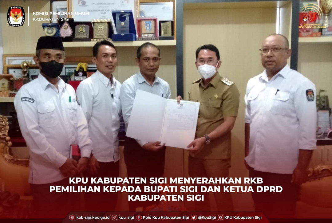Sigi, kab-sigi.kpu.go.id -Komisi Pemilihan Umum Kabupaten Sigi menyerahkan Dokumen penyusunan Rencana Kebutuhan Biaya (RAB) Pemilihan Bupati dan Wakil Bupati Sigi Tahun 2024 kepada Bupati Sigi, Senin (01/08). Ketua KPU Kabupaten Sigi Soleman, di dampingi Anggota KPU Sigi Hairil, Sekretaris KPU Kabupaten Sigi Moh.Taufik dan Kasubbag Perencanaan, Data dan Informasi Suyudin, menyerahkan Dokumen RAB Pemilihan tahun 2024 kepada Bupati Sigi dan Juga ditembuskan kepada Ketua DPRD Kabupaten Sigi. Soleman mengemukakan hal ini menindaklanjuti surat Ketua KPU Provinsi Sulawesi Tengah Nomor 225/KU.02/72/2022 tanggal 23 Maret 2022 perihal Penyiapan Anggaran Pemilihan Tahun 2024. Dalam kesempatan yang sama, Bupati Sigi Mohammad Irwan menerima dokumen RAB Pemilihan dan langsung di desposisikan ke Plh. Kepal Dinas Keuangan dan Aset Daerah Kabupaten Sigi. Sementara secara terpisah Ketua DPRD Kabupaten Sigi Rizal Intjenae saat ditemui, mengungkapkan akan membahas lebih lanjut RAB Pemilihan ditingkatan DPRD Kabupaten Sigi. #KPUMelayani #PemiluSerentak2024 #HumasKPUKabupatenSigi