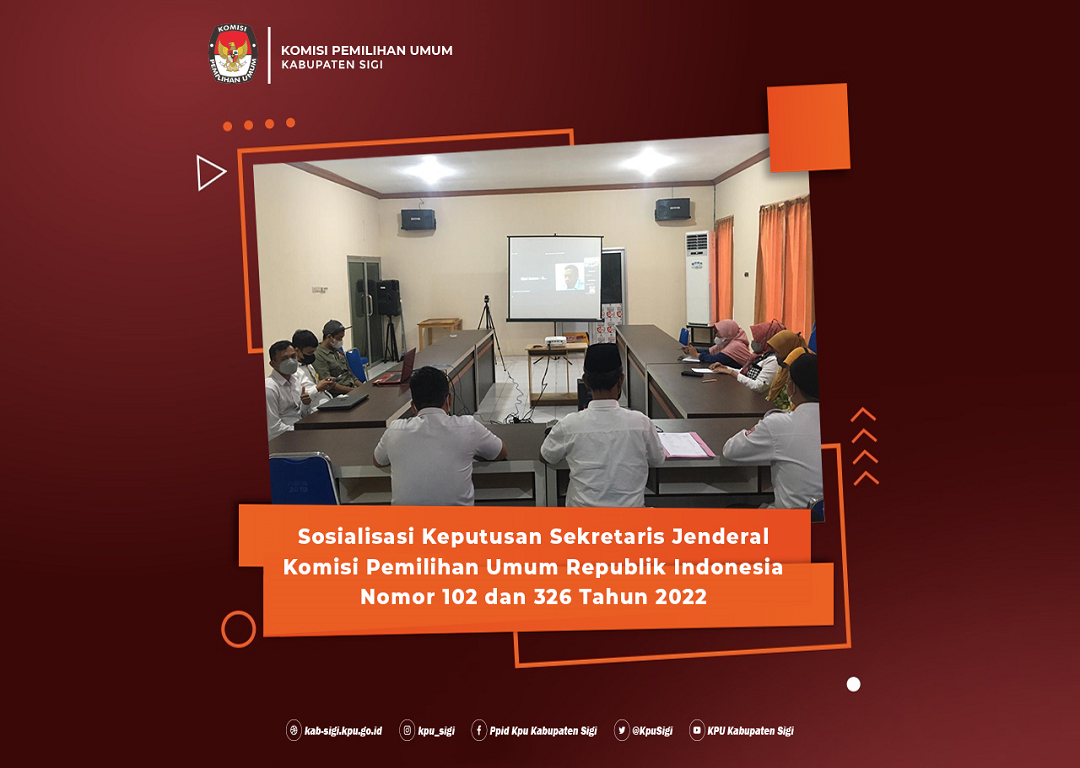kab-sigi.kpu.go.id, Komisi Pemilihan Umum Kabupaten Sigi melaksanakan Sosialisasi Keputusan Sekretaris Jenderal Komisi Pemilihan Umum Nomor 102 Tahun 2022 dan Surat Keputusan Sekretaris Jenderal Komisi Pemilihan Umum Nomor 326 Tahun 2022, Kamis (14/04). Bertempat di Aula Kantor Komisi Pemilihan Umum Kabupaten Sigi, kegiatan Sosialisasi di buka langsung oleh Moh.Taufik selaku Sekretaris Komisi Pemilihan Umum Kabupaten Sigi dan dilanjutkan dengan pembahasan materi Keputusan Sekretaris Jenderal Komisi Pemilihan Umum Nomor 102 Tahun 2022 tentang Pedoman Pemberian Cuti PNS di Lingkungan Sektretariat Komisi Pemilihan Umum RI, Komisi Pemilihan Umum Provinsi dan Komisi Pemilihan Umum Kabupaten/Kota dan Surat Keputusan Sekretaris Jenderal Komisi Pemilihan Umum Nomor 326 Tahun 2022 tentang Petunjuk Teknis Pemberian Tunjangan Kinerja Pegawai di Lingkungan Sekretariat Jenderal Komisi Pemilihan Umum RI, Komisi Pemilihan Umum Provinsi dan Komisi Pemilihan Umum Kabupaten/Kota, oleh narasumber Rizal Jasman selaku Kepala Bagian Hukum dan SDM Komisi Pemilihan Umum Provinsi Sulawesi Tengah. Dalam materinya, Rizal Jasman memaparkan jenis-jenis cuti dan tata cara pemberian cuti di Lingkungan Komisi Pemilihan Umum khususnya di Satuan kerja Komisi Pemilihan Umum Kabupaten Sigi. Selanjutnya, dalam materi di uraikan juga tentang petunjuk teknis pemberian Tunjangan Kinerja (Tukin) Pegawai di Lingkungan Sekretariat Komisi Pemilihan Umum Kabupaten/Kota. Kegiatan Sosialisasi dilaksanakan secara Daring yang di hadiri oleh para Kasubag dan Staf Pegawai ASN serta PPNPN Sekretariat Komisi Pemilihan Umum Kabupaten Sigi. Hadir juga perwakilan dari Komisi Pemilihan Umum Kabupaten/Kota Se Sulawesi Tengah. #KPUMelayani #Pemilu2024Siap