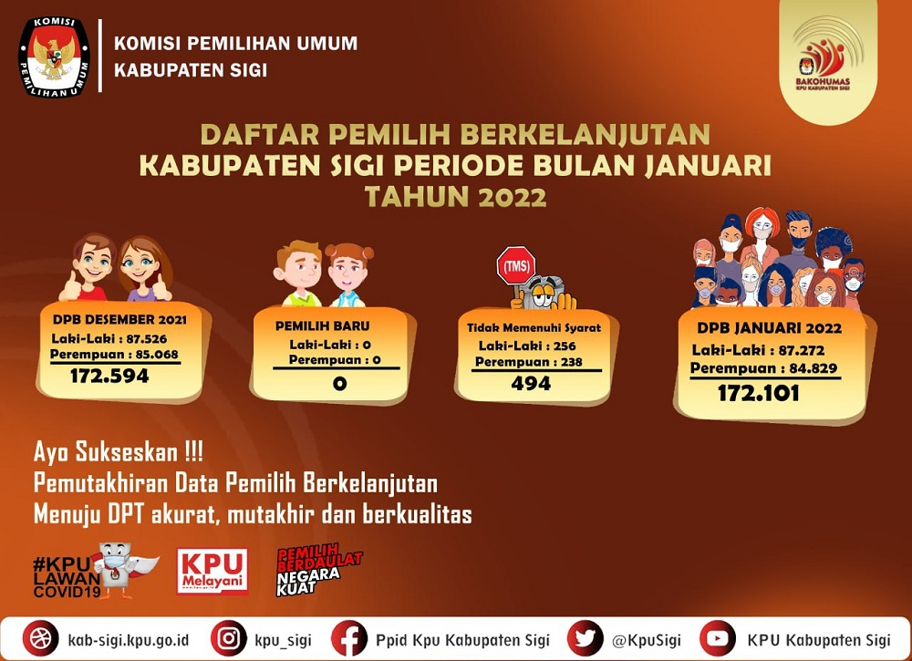 Press Release KPU Sigi Tanggal 28 Februari 2021 Sigi-KPU Kabupaten Sigi pada tanggal 25 Februari 2022 telah melaksanakan Rapat Pleno Rekapitulasi Daftar Pemilih Berkelanjutan Periode Bulan Februari 2022, yang dilaksanakan secara daring, yang dihadiri oleh 5 (lima) orang Komisioner KPU Kabupaten Sigi dan Staff Sekretariat KPU Kabupaten Sigi, dimana pelaksanaan Rapat Pleno ini didasarkan ketentuan Pasal 20 huruf (l) Undang-Undang Nomor 7 Tahun 2017 Tentang Pemilihan Umum yang menyatakan “KPU Kabupaten/Kota berkewajiban melakukan pemutakhiran dan memelihara data pemilih secara berkelanjutan dengan memperhatikan data kependudukan sesuai ketentuan peraturan perundang-undangan”, dan juga pasal 7 ayat (1) huruf d Peraturan Komisi Pemilihan Umum Nomor 6 Tahun 2021 tentang Pemutakhiran Data Pemilih Berkelanjutan yang menyatakan “KPU Kabupaten/Kota melakukan rekapitulasi PDPB tingkat Kabupaten/Kota”. Ketua KPU Sigi, Soleman menyatakan bahwa pelaksanaan Rapat Pleno Rekapitulasi Daftar Pemilih Berkelanjutan untuk periode Februari 2022 pelaksanaannya dilakukan secara daring karena adanya pembatasan aktifitas kerja berdasarkan Keputusan KPU Kabupaten Sigi Nomor 15/SDM.07.1/7210/2022 tentang Penyesuaian Sistem Kerja di Lingkungan KPU Kabupaten Sigi selama Pemberlakuan Pembatasan Kegiatan Masyarakat Pada Masa Pandemi Corona Virus Disease 2019 serta Penetapan PPKM Level III oleh Bupati Kabupaten Sigi sehingga pelaksanaan Rapat Pleno ini dilaksanakan secara daring dengan tetap menerapkan standar protokol kesehatan pencegahan covid-19, dan berdasarkan hasil Rapat Pleno Rekapitulasi Daftar Pemilih Berkelanjutan dan penandatanganan Berita Acara KPU Kabupaten Sigi Nomor 11/PL.01/7210/2022 Tentang Rapat Pleno Pemutakhiran Daftar Pemilih Berkelanjutan Tahun 2022 Periode Bulan Februari 2022, tanggal 25 Februari 2022 Rekapitulasi Daftar Pemilih Berkelanjutan berjumlah sebanyak 172.095 (Seratus Tujuh Puluh Dua Ribu Sembilan Puluh Lima) Pemilih yang terdiri dari 87.720 (Delapan Puluh Tujuh Ribu Tujuh Ratus Dua Puluh) Pemilih Laki-Laki dan 84.825 (Delapan Puluh Empat Ribu Delapan Ratus Dua Puluh Lima) Pemilih Perempuan yang tersebar di 15 Kecamatan di wilayah Kabupaten Sigi. Ketua Devisi Perencanaan, Data dan Informasi KPU Kabupaten Sigi Rosnawati, menambahkan bahwa hasil pemutakhiran data pemilih berkelanjuta untuk periode bulan februari 2022 yang ditetapkan dalam Rapat Pleno KPU Kabuaten Sigi, ada pengurangan daftar pemilih dari periode Bulan Januari 2022 yang berjumlah 172.101 (Seratus Tujuh Puluh Dua Ribu Seratus Satu) Pemilih menjadi berjumlah 172.095 (Seratus Tujuh Puluh Dua Ribu Sembilan Puluh Lima) Pemilih pada periode bulan Februari 2022, hal ini didasarkan bahwa pada periode bulan Februari 2022 terdapat 6 (enam) pemilih yang tidak memenuhi syarat karena meninggal dunia, dengan rincian pemilih laki-laki sebanyak 3 (tiga) pemilih dan pemilih perempuan sebanyak 3 (tiga) pemilih yang tersebar di 2 (dua) wilayah Kecamatan yaitu Kecamatan Sigi Biromaru dan Kecamatan Dolo,. Bahwa hasil dari penetapan Rekapitulasi Daftar Pemilih Berkelanjuran Tahun 2021 periode bulan Februari ini akan menjadi bahan dalam pelaksanaan Forum Koordinasi Pemutakhiran Data Pemilih Berkelanjutan (DPB) tingkat Kabupaten Sigi yang dilaksanakan setiap 3 (tiga) bulan sekali hal ini sesuai dengan ketentuan dalam Pasal 10 ayat (1) PKPU Nomor 6 Tahun 2021 Tentang Pemutakhiran Data Pemilih Berkelanjutan yang menyatakan “KPU Kabupaten/Kota menyelenggarakan forum kordinasi PDPB tingkat kabupaten/kota sebagaimana dimaksud dalam Pasal 7 ayat (2) paling sedikit setiap 3 (tiga) bulan sekali”, hasil penetapan ini akan kami umumkan juga secara resmi baik melalui media pengumuman di Kantor KPU Kabupaten Sigi juga melalui Media Website KPU Sigi dan media sosial KPU Kabupaten Sigi sebagai bagian dari proses sosialisasi kepada publik terhadap hasil pelaksanaan Pemutakhiran Data Pemilih Berkelanjutan yang telah dilakukan oleh KPU Kabupaten Sigi, harapan kami dan juga himbauan kepada seluruh warga masyarakat Kabupaten Sigi agar dapat berpartisipasi aktif dalam pelaksanaan Pemutakhiran Data Pemilih Berkelanjutan yang dilaksanakan oleh KPU Kabupaten Sigi baik mengecek melalui link website https://lindungihakmu.kpu.go.id/ atau juga bisa langsung mendatangi Kantor KPU Kabupaten Sigi setiap hari kerja, tambah Rosnawaty.