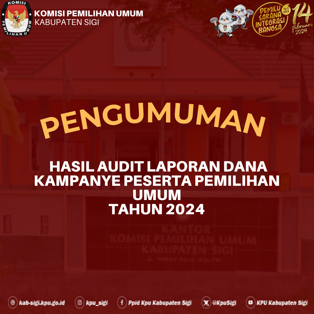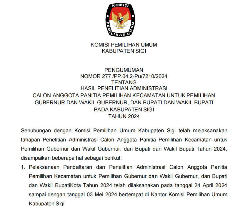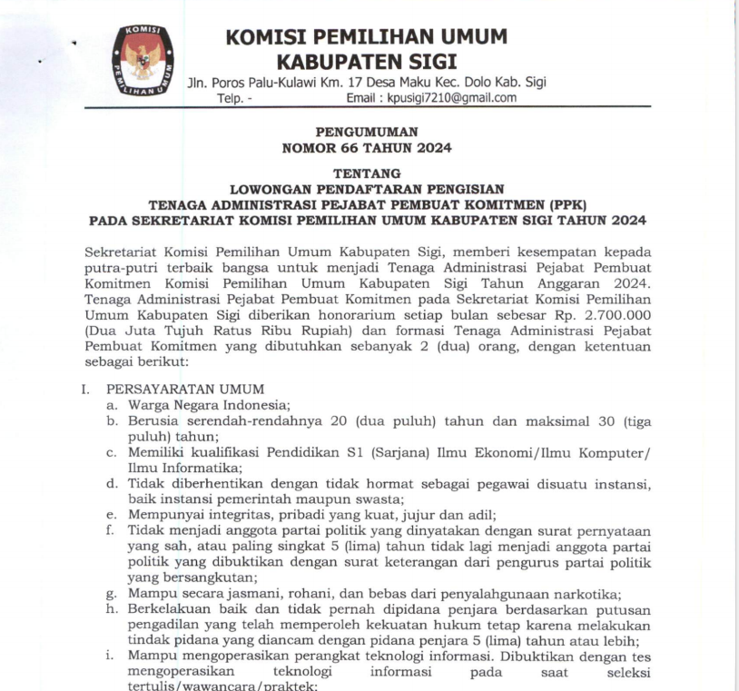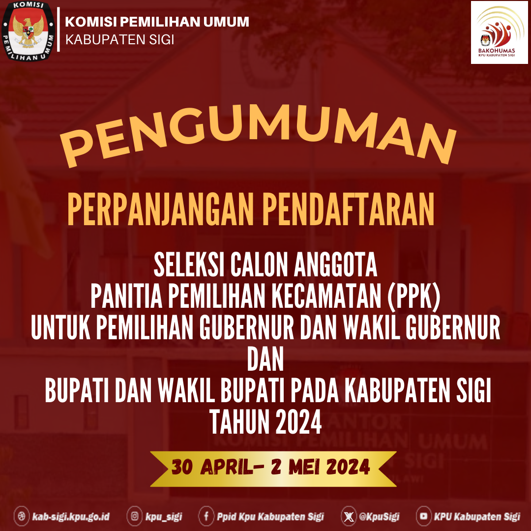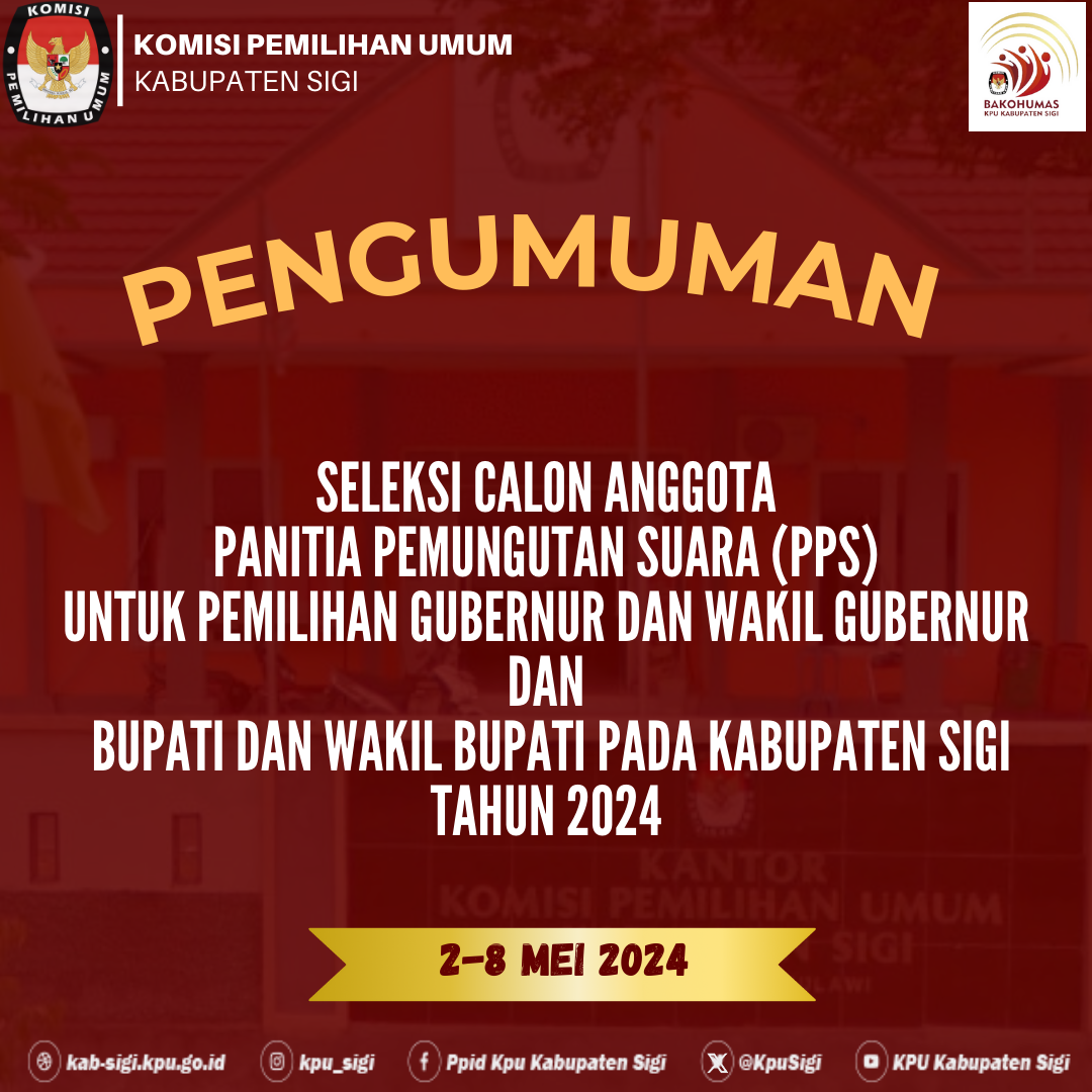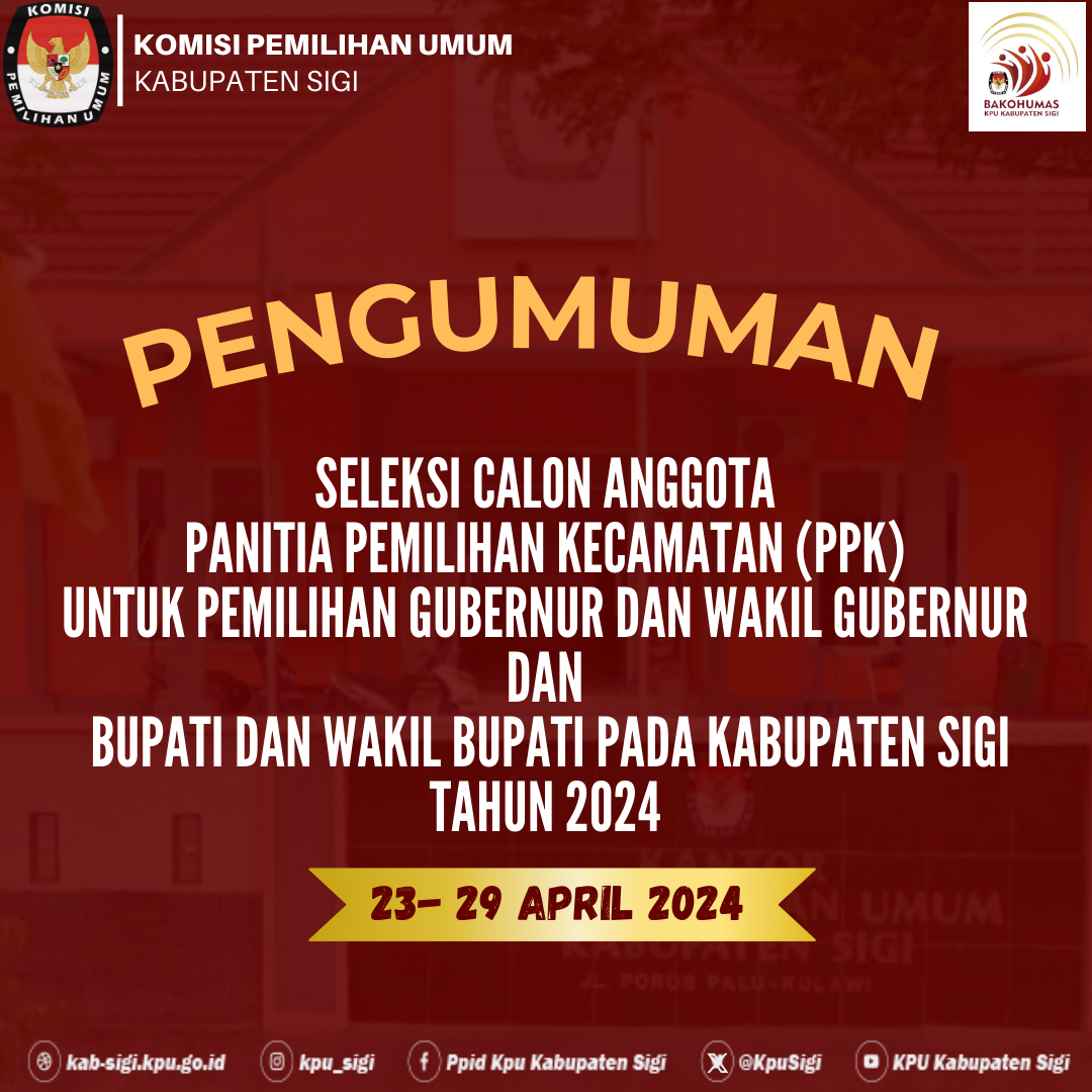 Dalam rangka pembentukan Calon Anggota Panitia Pemilihan Kecamatan untuk Pemilihan Gubernur dan Wakil Gubernur, Bupati dan Wakil Bupati, Tahun 2024, Komisi Pemilihan Umum Kabupaten Sigi mengundang warga Negara Indonesia yang memenuhi Kualifikasi untuk mendaftarkan diri menjadi Anggota Panitia Pemilihan Kecamatan untuk Pemilihan Gubernur dan Wakil Gubernur, dan Bupati dan Wakil Bupati dengan mengunduh Pengumuman Seleksi Calon Anggota Panitia Pemilihan Kecamatan (PPK) dan Persyaratan-persyaratan dibawah ini :