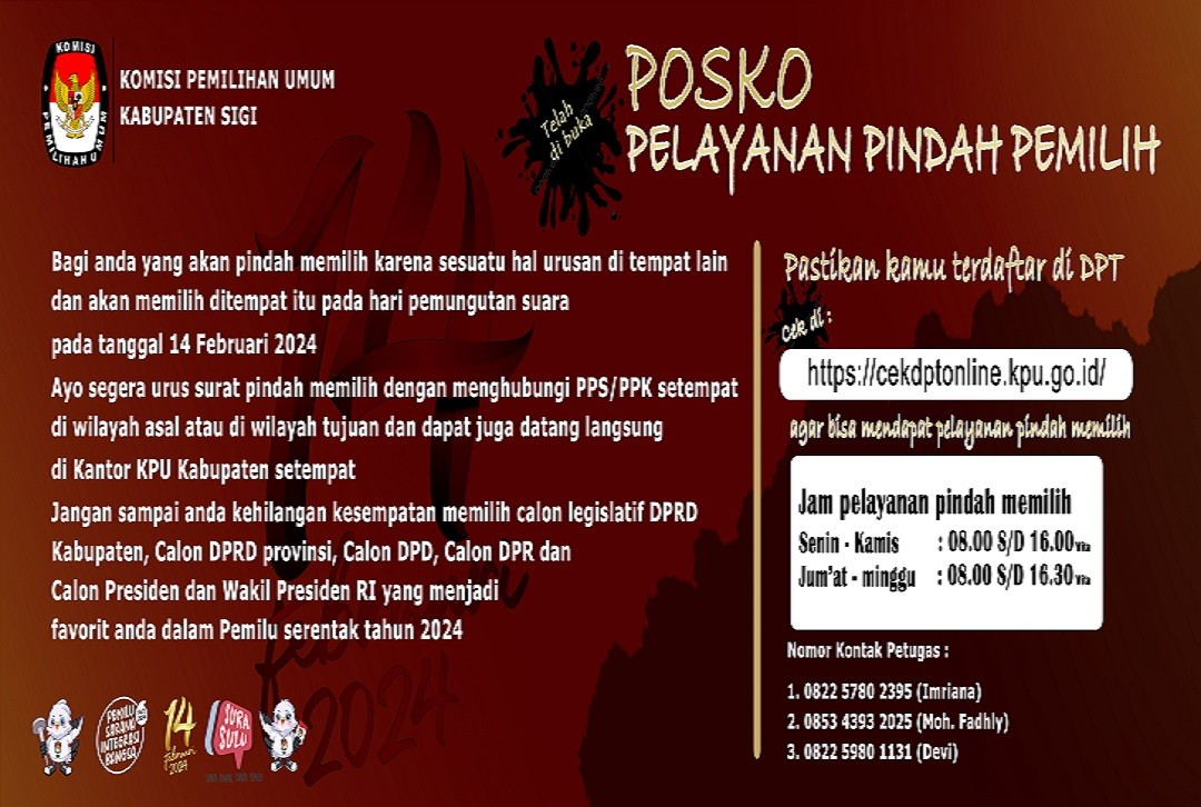 Sigi, kab-sigi.kpu.go.id- TemanPemilih, KPU Kabupaten Sigi membuka Posko Pelayanan Pindah Pemilih, ini dilakukan sebagai tindak lanjut dari tahapan Daftar Pemilih Tambahan (DPTB) dan sebagai upaya untuk memudahkan masyarakat yang terdata di Daftar Pemilih Tetap (DPT), namun pada hari pemungutan suara tidak bisa menyalurkan hak pilihnya di Tempat Pemungutan Suara (TPS) terdaftar karena alasan tertentu.
