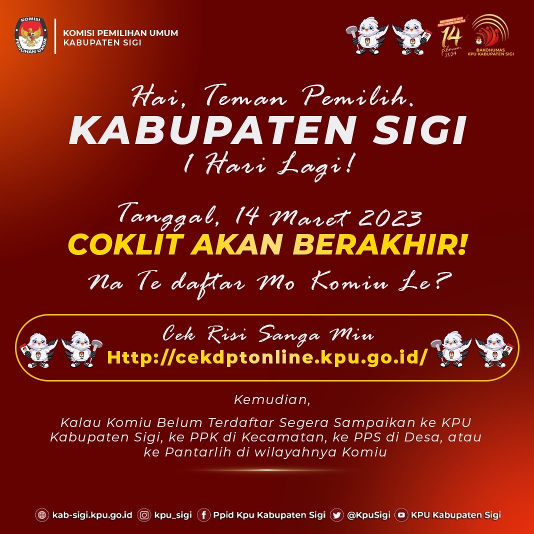 Hai #temanpemilih Warga Sigi, 1 Hari Lagi Waktu Pelaksanaan COKLIT akan segera berakhir ...